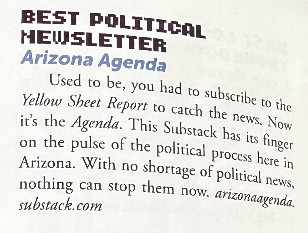 The local culture magazine declared that the Agenda “has its finger on the pulse of the political process here in Arizona” and named us overall Best “Podcast/Blog/Substack” (in a tie with the Finding Arizona Podcast).