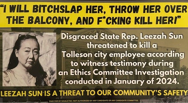 The mailer was paid for by Sigale PAC, which doesn’t show up anywhere in the state’s godawful campaign finance system. But they’re not the only ones spending to defeat Sun. Realtors have also spent almost $13,000 so far on mailers in the district through the Responsible Leadership for AZ PAC, according to the godawful campaign finance system.