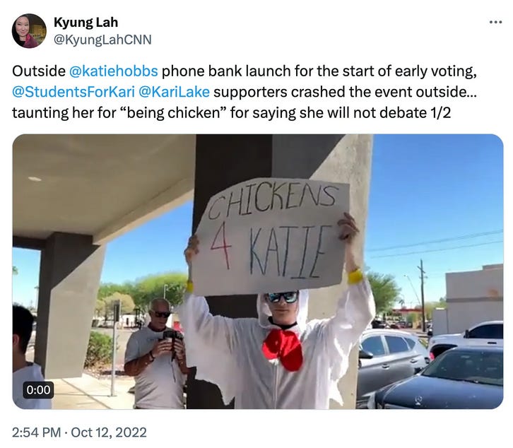 Queen of the molehill: Kari Lake, who fired off countless over-the-top statements and held press conferences about Gov. Katie Hobbs’ refusal to debate her in 2022, tells KTAR’s Mike Broomhead the story about her refusal to debate her GOP primary challenger, Pinal County Sheriff Mark Lamb,1 being “blown out of proportion.” Lake claims she did debate Lamb because the two appeared in a non-debate format. Hobbs and Lake also appeared in non-debates and that wasn’t good enough for Lake in 2022.