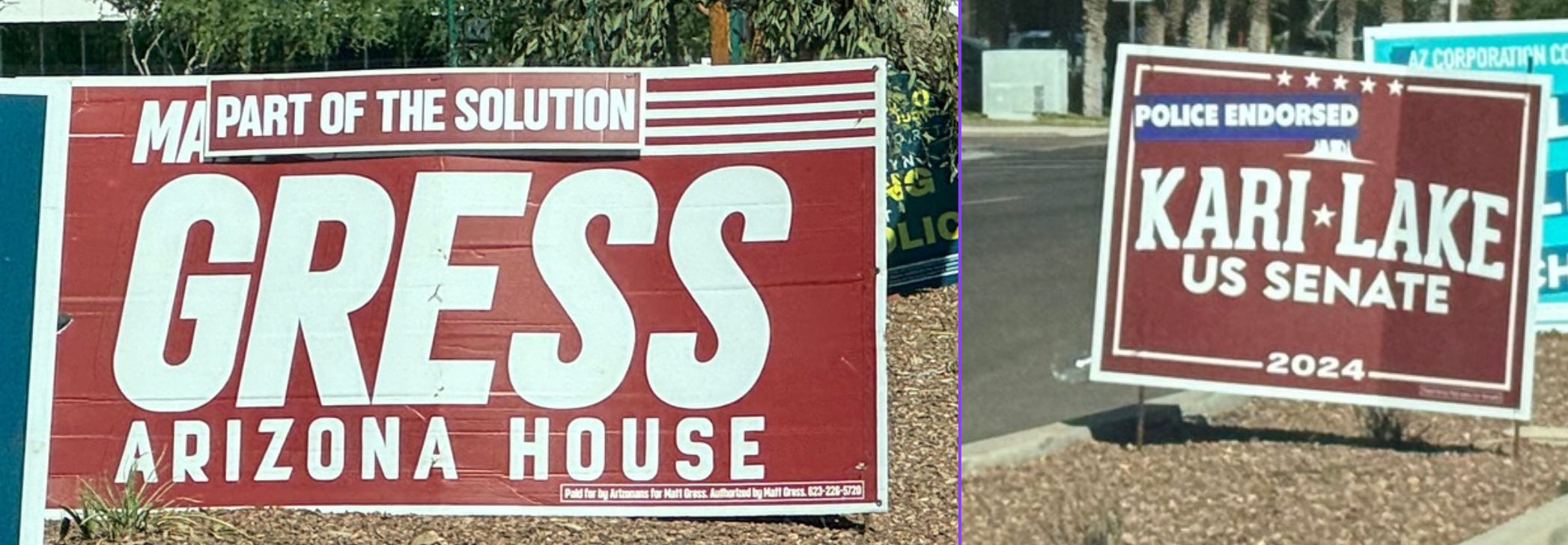 Republican state Rep. Matt Gress, for example, started adding “part of the solution” boosters on his signs after the primary. U.S. Senate candidate Kari Lake started adding a little “police endorsed” tag on her signs, seemingly after the Arizona Police Association endorsed her Democratic opponent, Ruben Gallego.