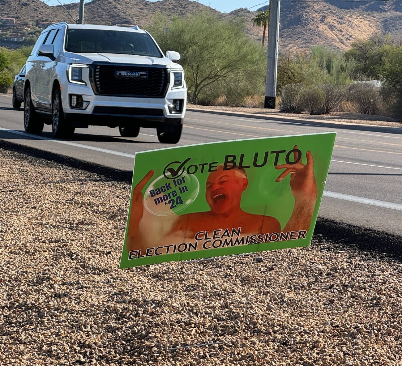 Case in point, there is no “Bluto” running for Corporation Commission. Maybe the sign promoting “Bluto” for Arizona Corporation Commission comes from write-in candidate Frank Bertone, who we noted last week is a Democratic QAnon believer who wants to give everyone free electricity.