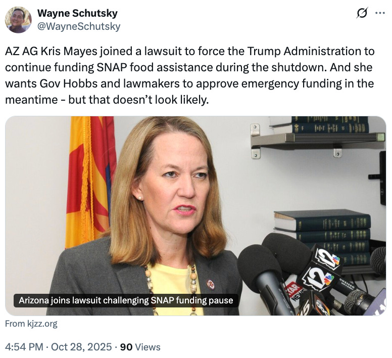The Kirktopus: Members of the Scottsdale and Fountain Hills city councils are considering measures to officially memorialize conservative activist Charlie Kirk, and the Phoenix City Council will consider a petition to name a street downtown after Kirk today in response to a citizen petition from “controversial activist” Jarrett Maupin, per KJZZ’s Wayne Schutsky.1 Meanwhile, Politico zooms in on Turning Point’s biggest test since Kirk’s death — the attempted recall of Mesa City Councilmember Julie Spilsbury in Tuesday’s election. And so does the New York Times. And the Republic’s Stephanie Murray has a breakdown of the Turning Point network and the scale of the conservative empire Kirk built, which has only grown since his assassination.