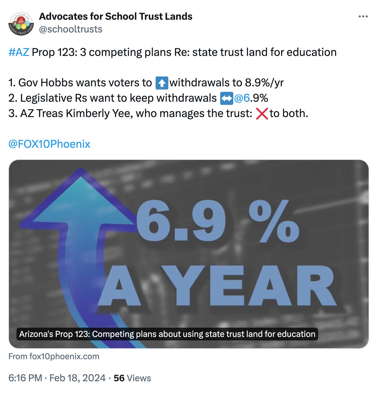 No one agrees on Prop 123: There are now three competing plans to expand the Gov. Doug Ducey-era Prop 123 to raise teacher pay using state land trust revenue after House Republicans threw a new proposal into the mix, the Republic’s Stacey Barchenger reports. House Republicans want to draw 5.5% from state land trust money, Senate Republicans 6.9% and Democrats 8.9%. Republicans say they can work it out, and Gov. Katie Hobbs has yet to talk to Republican leadership about a compromise. Meanwhile, the Mesa Public Schools Governing Board is considering cutting 385 positions next year due to low enrollment and waning COVID-19 funding, per 12News’ Chase Golightly.