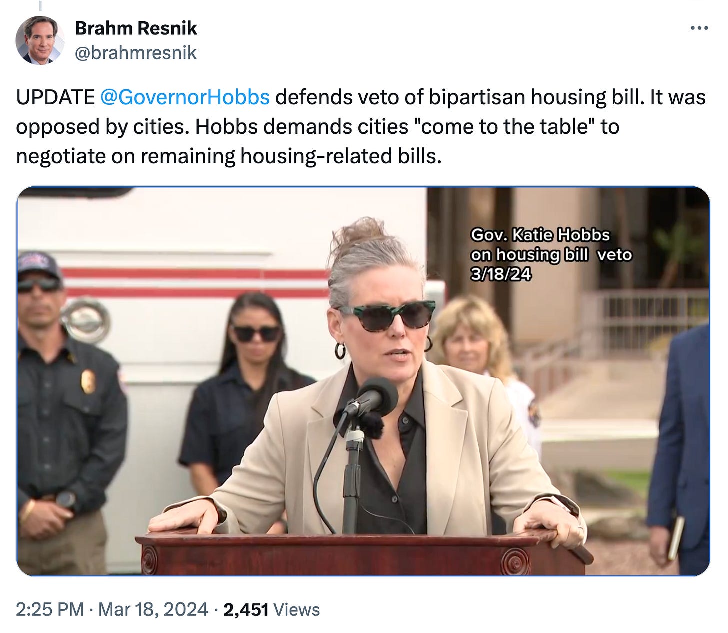 Not in Katie’s Backyard: Gov. Katie Hobbs vetoed the “Starter Homes Act” that would have barred some cities and towns from regulating lot sizes for single-family homes. The bill had bipartisan support, but like all of the city-centric solutions that lawmakers have proposed to Arizona’s housing crisis, city leaders and the League of Arizona Cities and Towns lobbied hard against it. Hobbs said the bill would have “put Arizona at the center of a housing reform experiment with unclear outcomes,” citing concerns from firefighters about residential density and the Department of Defense about density near military bases. Progressive Democrats like Rep. Analise Ortiz said it doesn’t appear the governor has a housing plan and called her veto “wishful thinking” and said the problem can be solved without zoning reform. Meanwhile, home developer and Senate President Warren Petersen criticized cities for being willing to change ordinances to let people sleep in their cars, but not zoning to speed up construction.