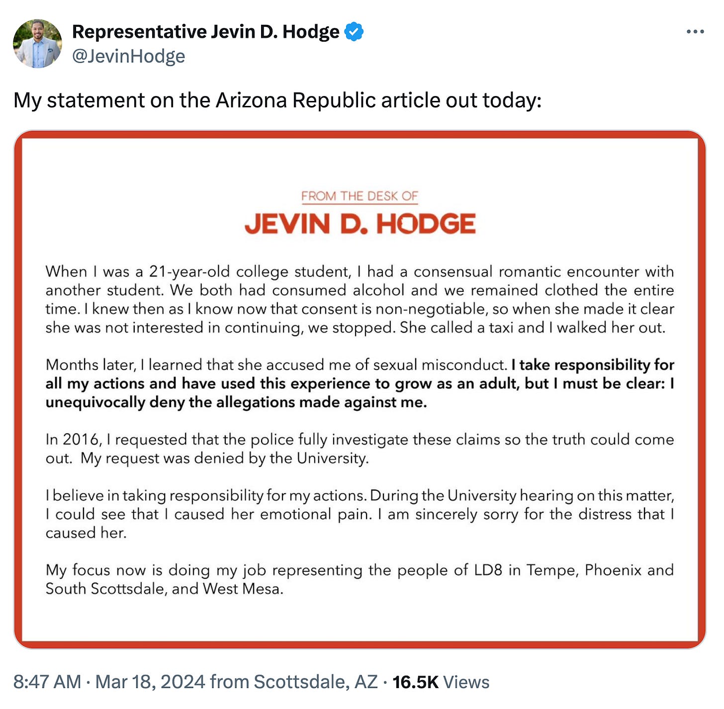 In 2022, Hodge ran to unseat Republican U.S. Rep. David Schweikert in Congressional District 1, and lost in a pretty close race. Pitzl reports the victim’s friend called the Democratic Congressional Campaign Committee in early 2023 to tell them about the alleged assault, but it never became public knowledge. Hodge announced he wouldn’t run again right around that time.