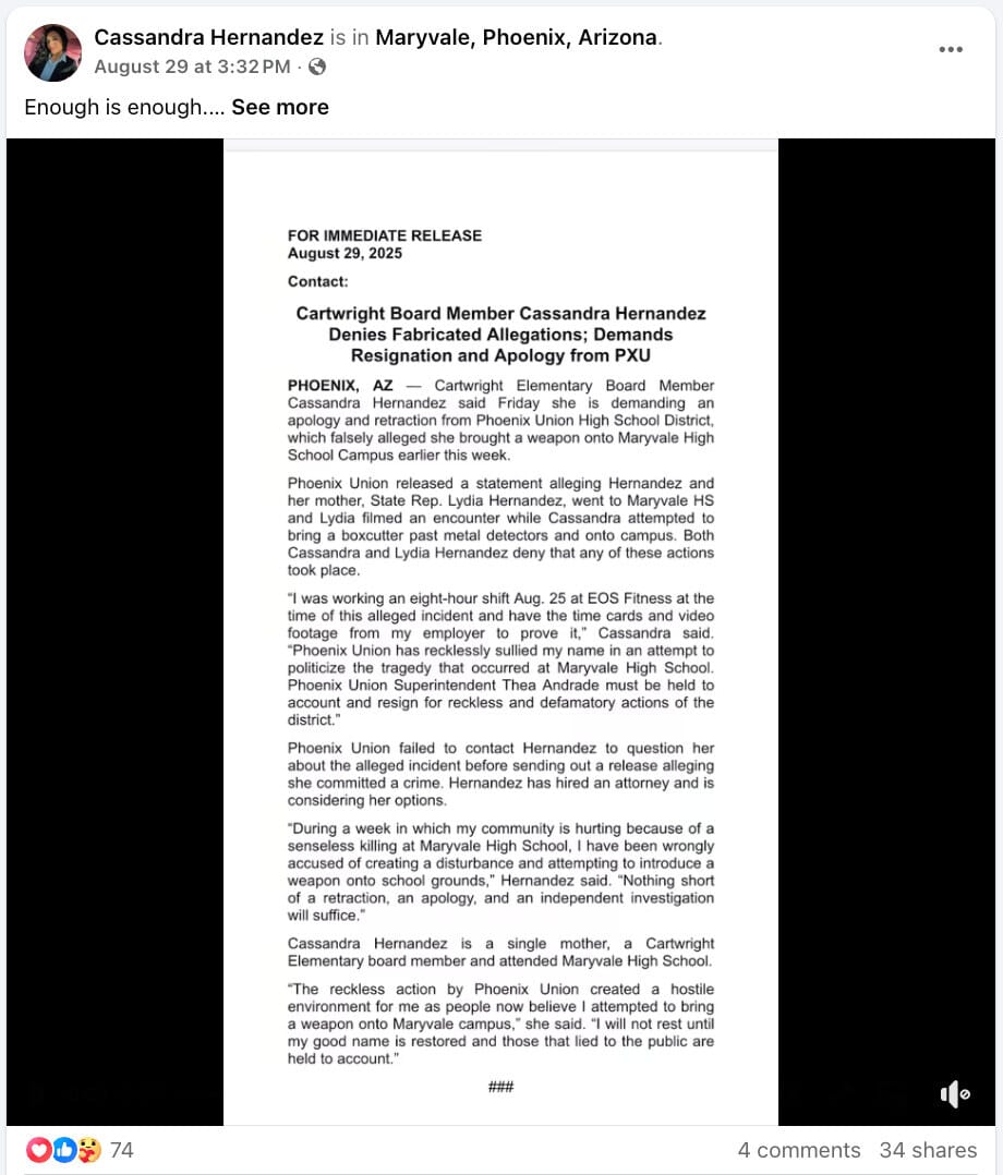 The younger Hernandez has provided receipts showing she was clocked in for a shift at a gym where she works, and now she’s threatening to sue Phoenix Union for defamation.