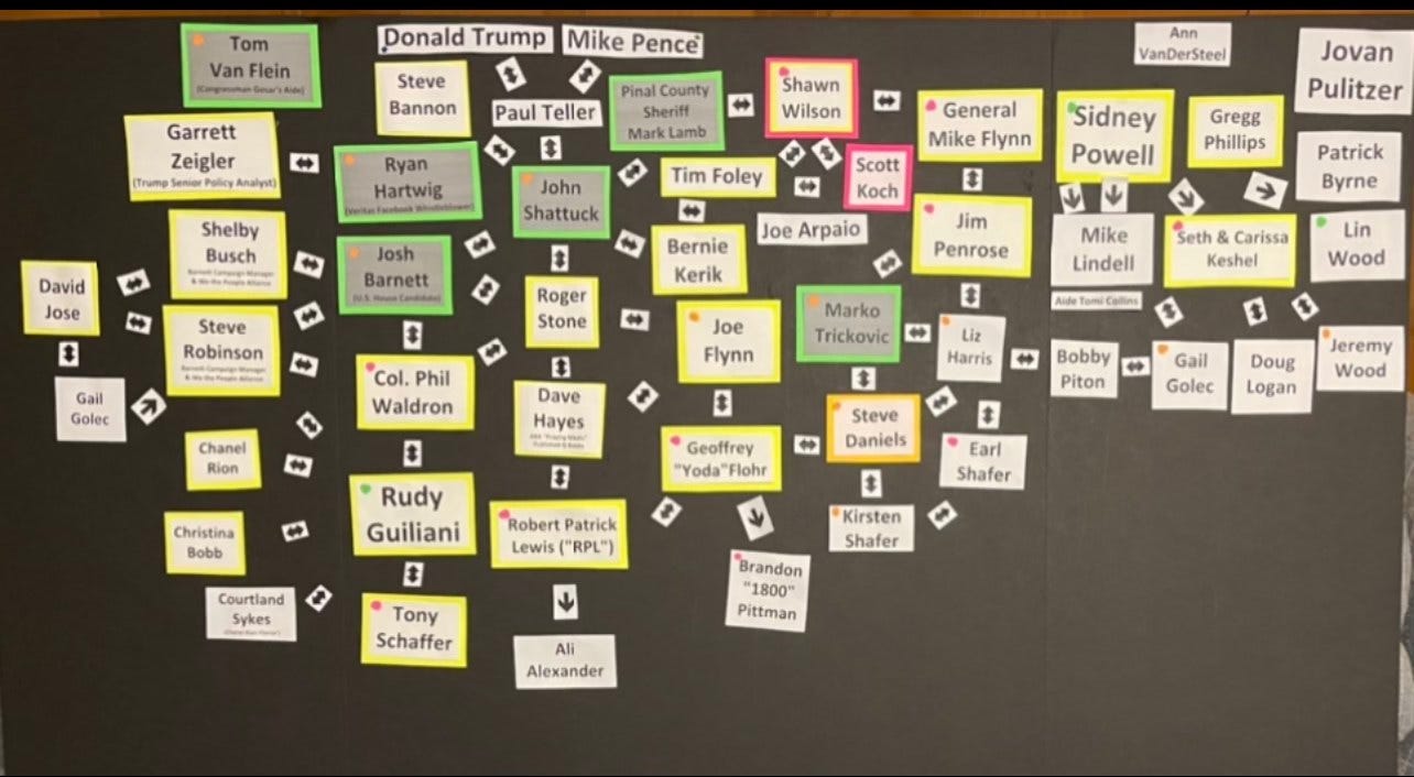 Now she’s on the lam, hiding out from many of her former cohorts, afraid for her life, unsure who to trust and utterly confused about whether she was used as a pawn to spread a massive lie and undermine the 2020 presidential election. To try to help her make sense of the last nine months, she created an organizational flow chart of names, color-coded by how they all came into her life and how they relate to each other.