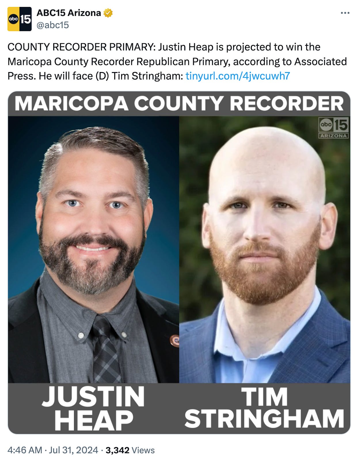 Up until then, the big question in the race for Maricopa County Recorder was whether Stephen Richer, who spent the last four years fending off election conspiracy theories, could fend off Republican primary challenger Justin Heap, an election skeptic who wants to curtail mail-in voting and require hand-counts of election results.
