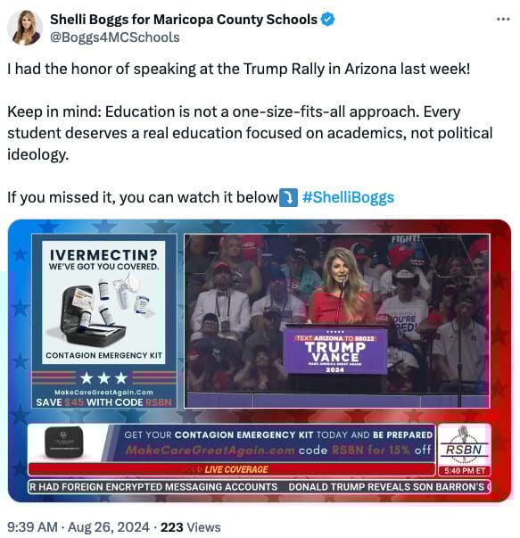 Boggs is the state outreach coordinator for Moms for Arizona, a conservative education advocacy group aligned with Kari Lake that wants federal funds be withheld from schools “that engage in politicizing … and radical indoctrination.”