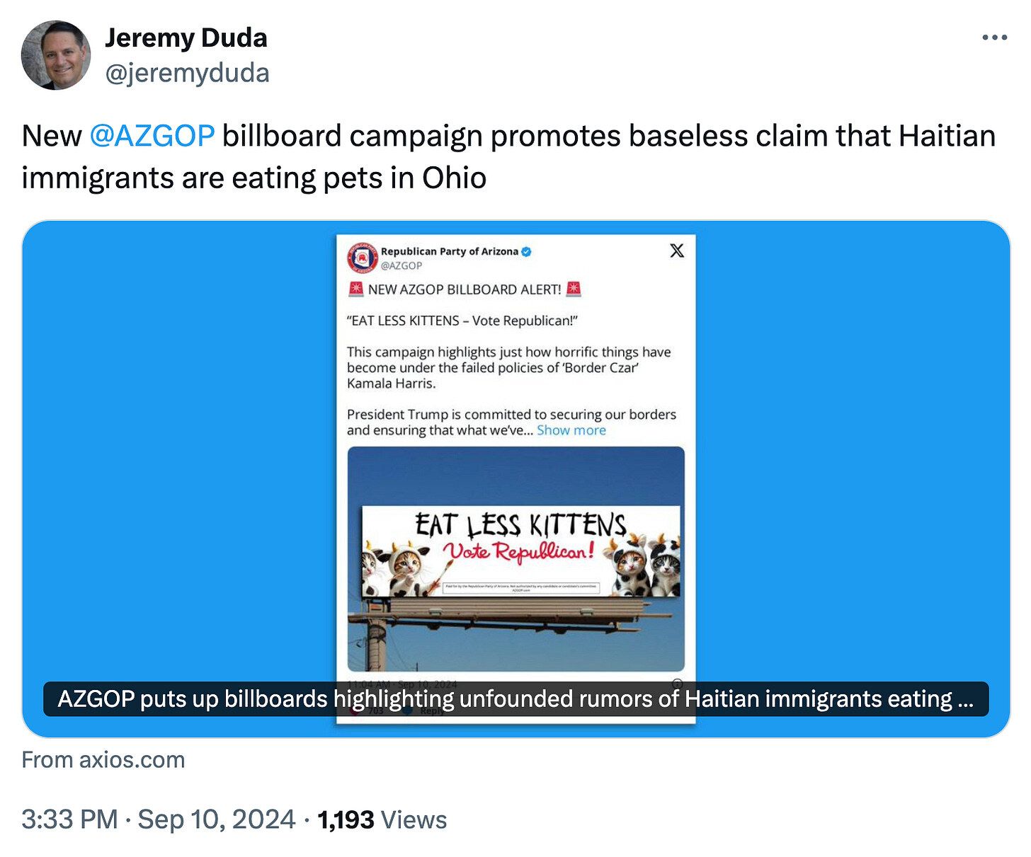 Welcome to Baja Arizona: Donald Trump is heading to Tucson on Thursday, marking what we believe may be the one-millionth visit by a presidential or vice presidential candidate so far this year. Vice presidential hopeful Tim Walz was in Phoenix yesterday ahead of last night’s presidential debate in Chicago, which came on the heels of vice presidential hopeful JD Vance's visit to Arizona last week.