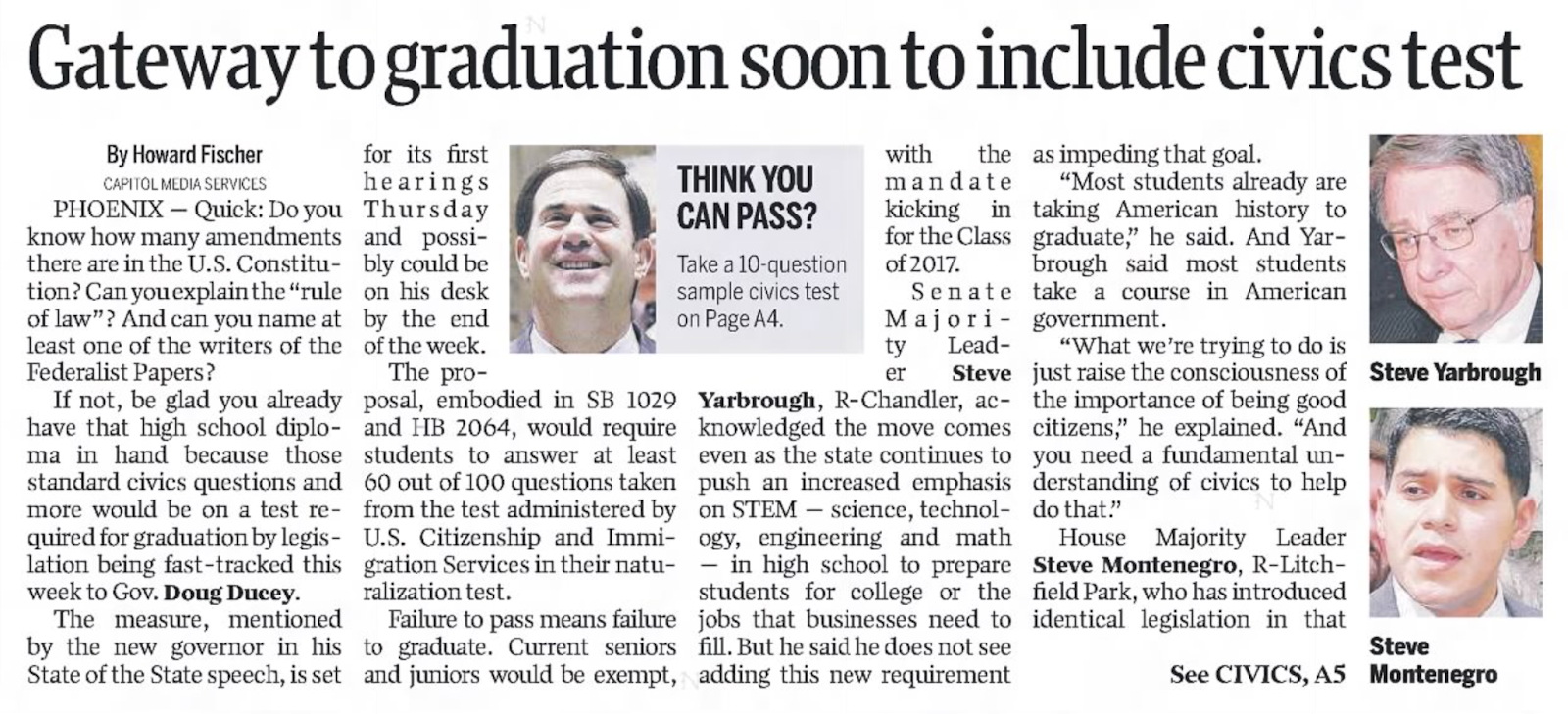 Ducey used that 2015 speech to push a civics test for high schoolers. If they want to graduate, students now have to answer correctly 60 out of 100 questions pulled from the test used by U.S. Citizenship and Immigration Services.