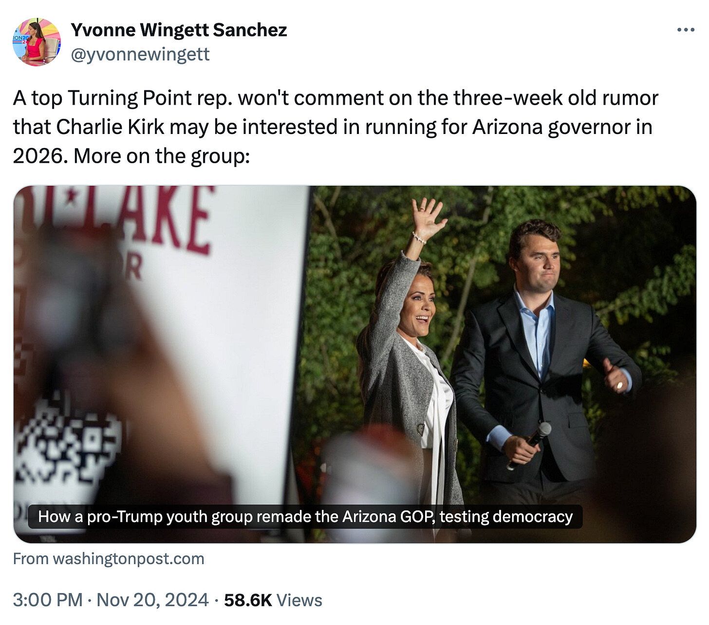 But we’re also laughing at the slight outrage we sense in this tweet from the Washington Post’s Arizona reporter, Yvonne Wingett Sanchez, about the age of the rumor that Turning Point refuses to comment on.