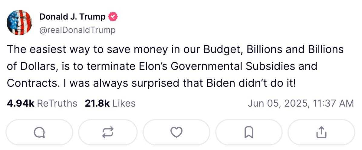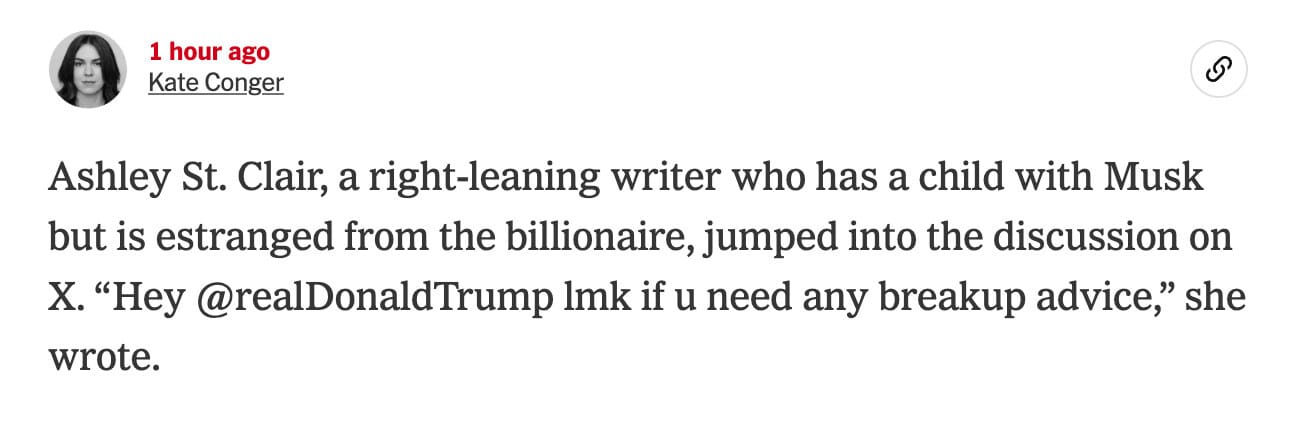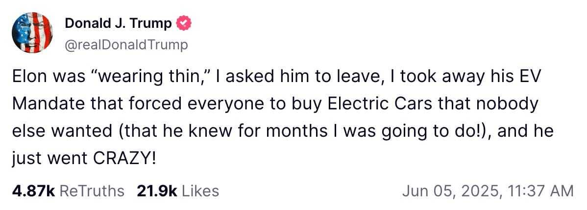 The New York Times has a liveblog up documenting each new development in the quarrel, which, as of our last check-in for the day, had culminated with Musk calling for Trump’s impeachment and Trump ally Steve Bannon suggesting Trump should deport Musk, who Bannon has “a strong belief” is an illegal alien.