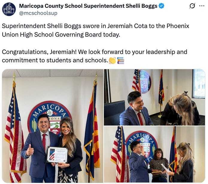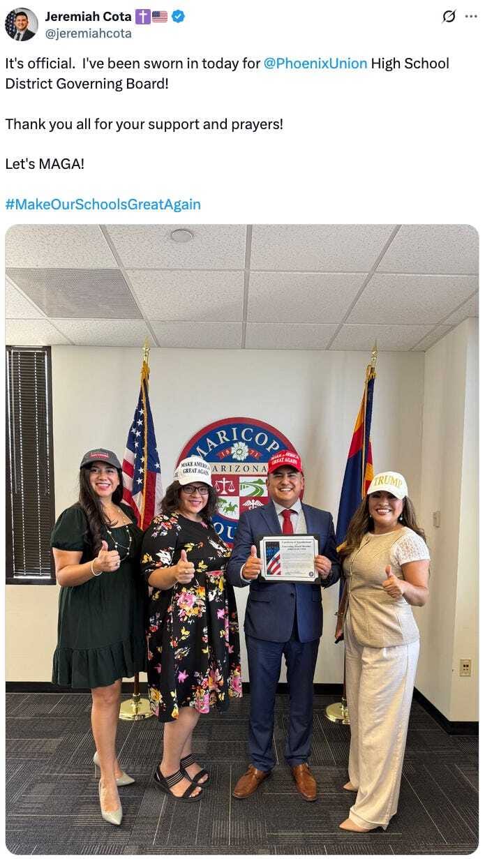 Jeremiah Cota was sworn into the Phoenix Union’s governing board yesterday. He posted about his appointment with the declaration: