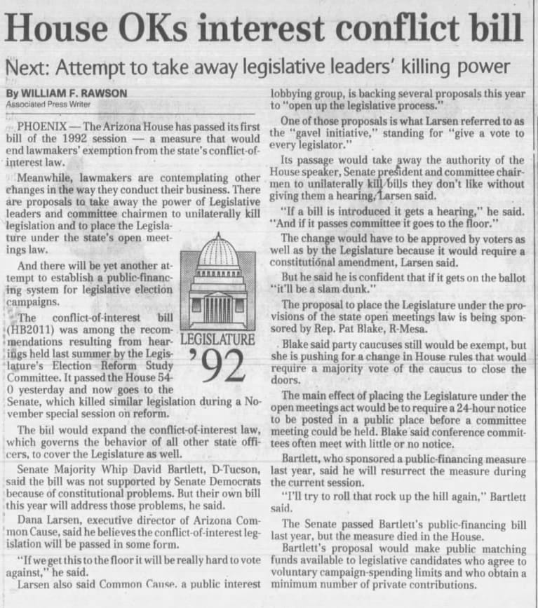 Arizona lawmakers didn’t become subject to the state’s conflict of interest laws until 1992, when the AzScam corruption probe forced ethics reforms. Before then, they operated only under House and Senate rules, while other public officials were held to state law. (Tucson Citizen, Jan 24, 1992)