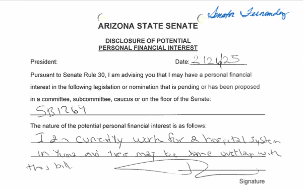 Sen. Brian Fernandez wrote on his Rule 30 disclosure form that he works for a Yuma hospital system that could overlap with SB1264 and filed the disclosure under “potential personal financial interest.”