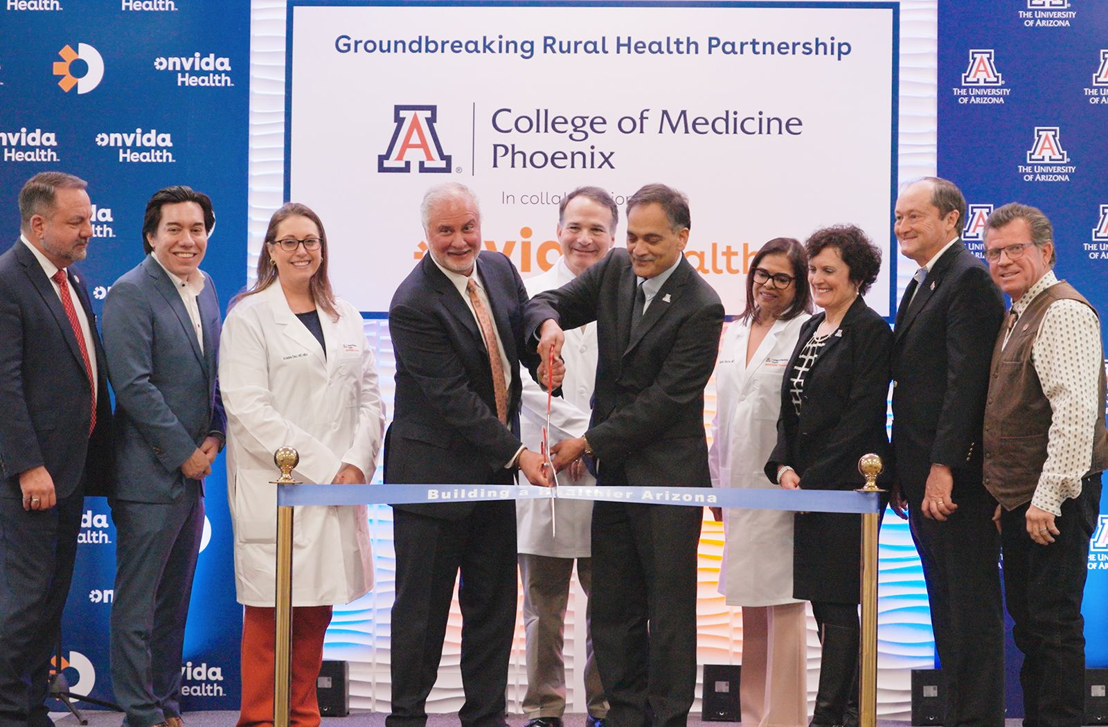 The UA’s medical school celebrated the announcement on LinkedIn, sharing photos of UA President Suresh Garimella wielding giant red scissors to cut a ribbon in front of a UA-Onvida banner, as both Fernandez and Dunn smile alongside him.