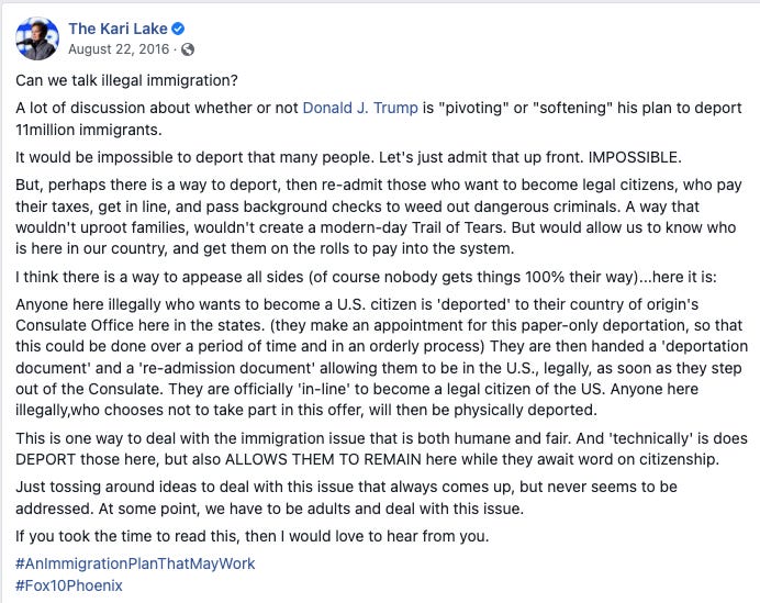 But here’s a Lake throwback that makes us smile: Lake’s 2016 plan for “paper-only deportations” in which nobody actually leaves the country and everyone is on a path to citizenship.