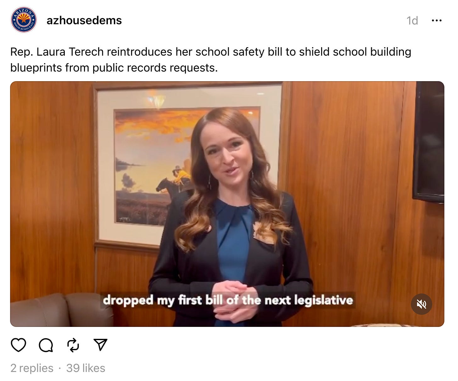 No school, no threats: Democratic Rep. Laura Terech introduced legislation to block school blueprints from being covered under Arizona’s public records law, hoping that her second attempt at the legislation will fare better, the Yellow Sheer Report reports. Neither blueprints nor safety will be an issue at four Paradise Valley Unified School District schools if the school board follows through with its proposal to close the schools amid declining enrollment, per AZFamily.