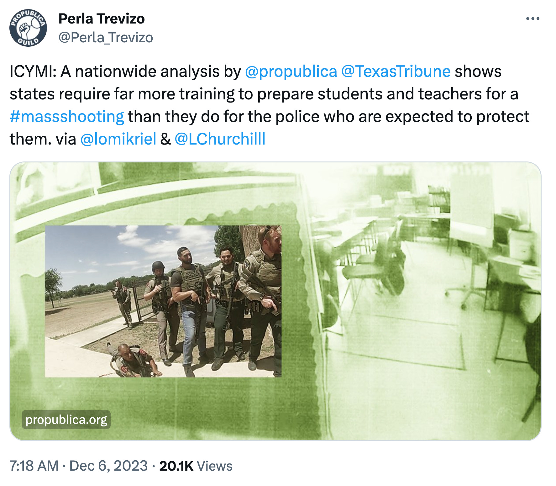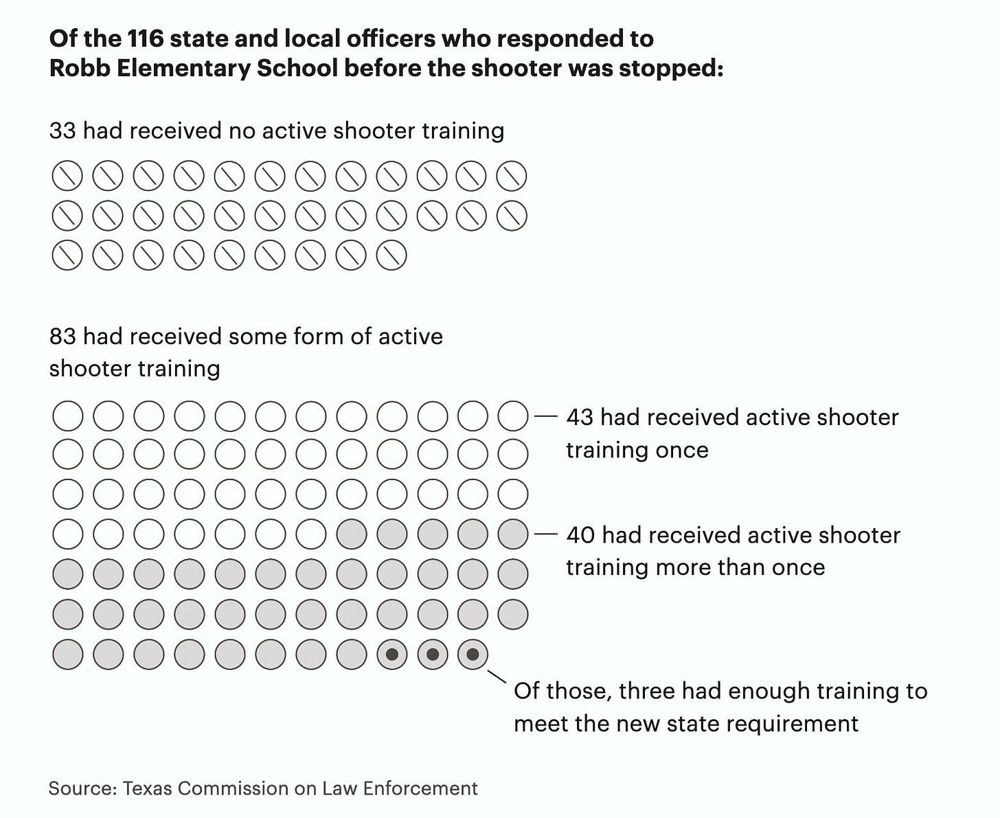 As ProPublica and the Texas Tribune laid bare in their most recent investigation into the mass murder at a Uvalde, Texas, elementary school, the students had plenty of training on how to respond to an active shooter. But of the more than 100 police who showed up to stop the gunman, about a quarter had no active shooter training at all, and only three had enough training to meet the requirements put into place after the shooting.