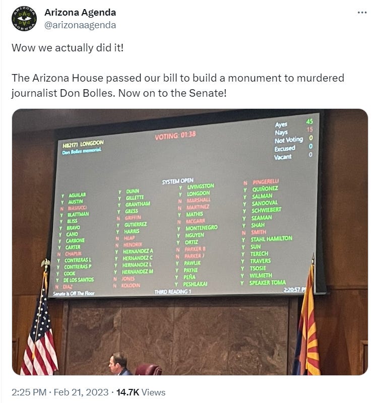 Special session for Don Bolles memorial; elections dates: Election officials want Gov. Katie Hobbs to call a special session next month to solve Arizona’s election dates and deadlines problem, Jen Fifield writes in Votebeat Arizona. Republican leaders don’t see the urgency, and election deniers want to use the opportunity to “address the root of the problem.”