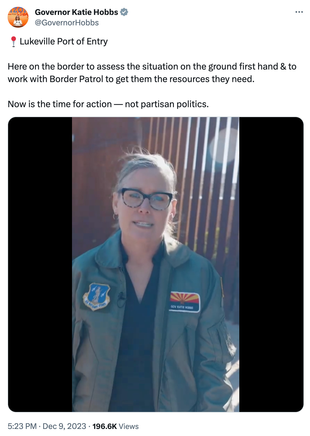 #EndTheChaos: Gov. Katie Hobbs wore her most olive green bomber jacket during her brief visit to see Lukeville’s shuttered port of entry on Saturday. She urged the federal government to “end the chaos” at the border and promised to stand up to unnamed “politicians on either side” and push them to get tough on the border. And she sent President Joe Biden an angry letter urging him to activate (and pay for) the National Guard at the border crossing, along with an oddly specific invoice for $512,529,333, a number she didn’t explain other than it’s the state’s cost for border security. Meanwhile, the New York Times’ Jack Healy is reporting from the ground in Lukeville, noting the area is facing two types of crises.