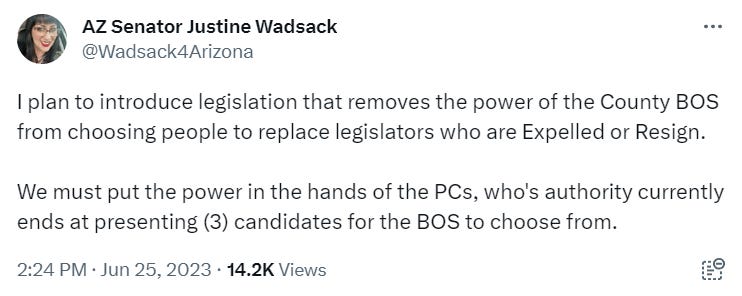 Bolick is a familiar face in Arizona political circles. She’s a former state lawmaker who is married to Arizona Supreme Court Justice Clint Bolick, and famously authored a bill to allow lawmakers to disregard the will of the voters in favor of picking their own “alternative slate” of presidential electors. She lost the GOP primary for Secretary of State last year to Mark Finchem.