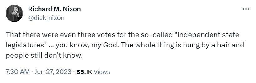 Shout-out to Shawnna: The U.S. Supreme Court rejected the “independent legislatures theory” that would have given state legislators nearly unchecked authority over how to conduct elections. Writing for the 6-3 majority, Chief Justice John Roberts said legislatures are not insulated from the “ordinary exercise of state judicial review.”