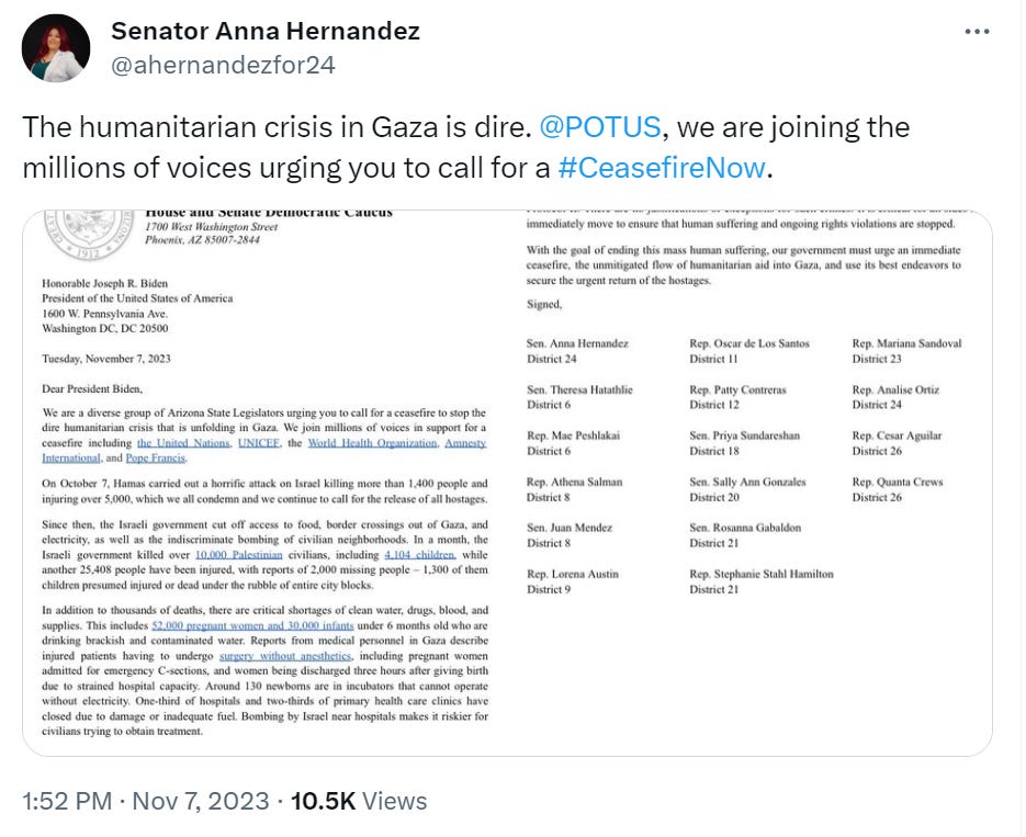 I don’t usually feel proud of the Az state legislature but want to make a shout out to those that signed the call for a ceasefire. Murdering children in our name and with tax dollars that could better be spent helping them is just wrong. As Rashida Tlaib asked her colleagues recently “the cries of israeli and palestinian children sound the same to me— why don’t they sound the same to you?” And finally , what does a “humanitarian pause” in the killing mean when we are arming the conflict? Are our policymakers just making sure that remaining palestinian civilians get food to eat before our bombs kill them? CEASEFIRE NOW! And END THE OCCUPATION!
