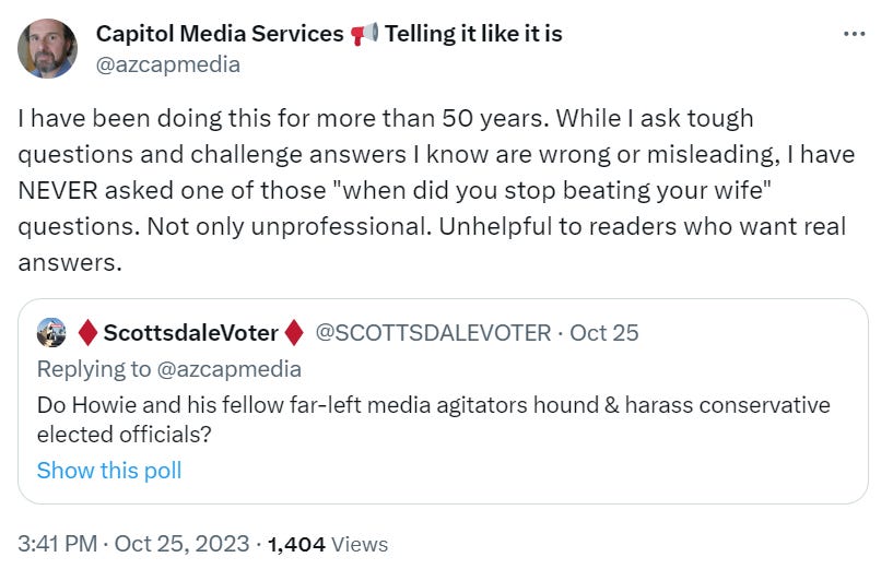 Maybe it was the new speaker calling: All six members of Arizona’s Republican congressional delegation supported new U.S. House Speaker “MAGA Mike” Johnson, who helped craft some of the less-conspiratorial arguments against certifying the 2020 election, as Rachel Leingang writes for the Guardian U.S.2 His ascension to speaker doesn’t bode well for the 2024 election. Elsewhere in D.C., Kari Lake’s friends in the “real news” are hounding U.S. Senate candidate Ruben Gallego with tough questions like, “Are you paid off by the cartel or are you selling out America for free?” He avoided the cameras by holding up his phone for what appears to be a fake call, the Republic’s Ronald Hansen writes.