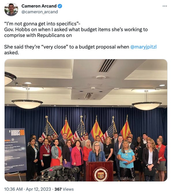 Still not Kari Lake: In her first 100 days in office, Gov. Katie Hobbs was not Kari Lake, she bragged in a guest opinion in the Republic titled ”I promised sanity as Arizona governor. Here's how I'm delivering it.” In it, the governor highlighted her accomplishments including signing some bills, visiting the border and creating an educator retention task force. Elsewhere in the Republic, reporter Stacey Barchenger writes that at the 100-day mark, Hobbs is hopeful that she and legislative leaders are making real progress on budget negotiations. And longtime Capitol scribe Howie Fischer notes that these past 100 days looked a lot like the first 100 days of former Democratic Gov. Janet Napolitano’s first administration 20 years ago.