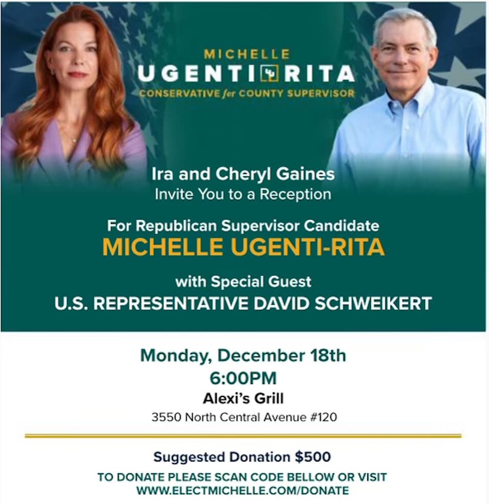 In good company: Ira Gaines, who pleaded guilty in March to a stock manipulation scheme, is hosting a reception for former Republican State Sen. Michelle Ugenti-Rita, who’s now running for the Maricopa County Board of Supervisors. The suggested donation for attendees is $500. Speaking of ethical lapses, also in attendance will be Republican Rep. David Schweikert, who was fined $50,000 for campaign finance violations in 2020, and hit with another $125,000 fine in 2022 for the same reasons.