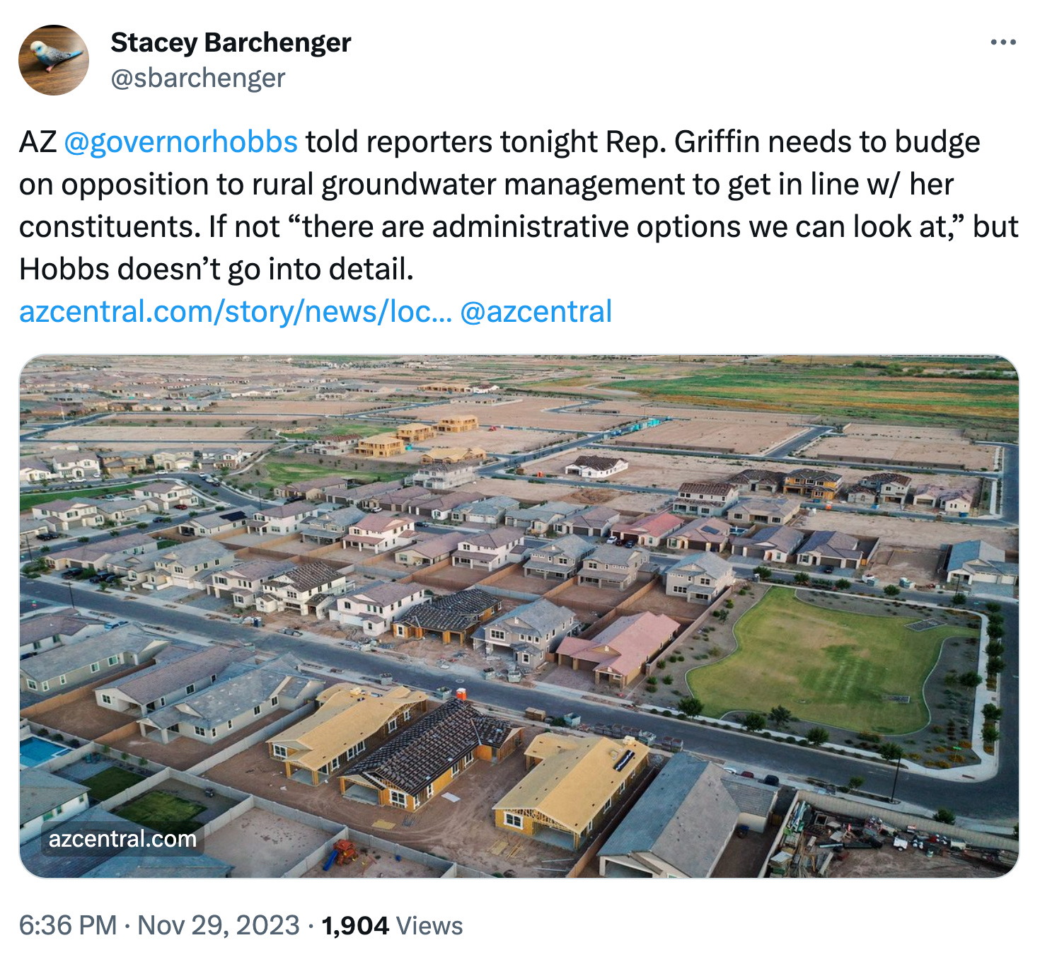 Her predecessor, former Gov. Doug Ducey, had buried a report showing that the West Valley had far less water than previously believed, she told reporters. The area was so dry that it no longer had the 100-year assured supply of water required under groundwater protection laws, which could have major ramifications on growth.