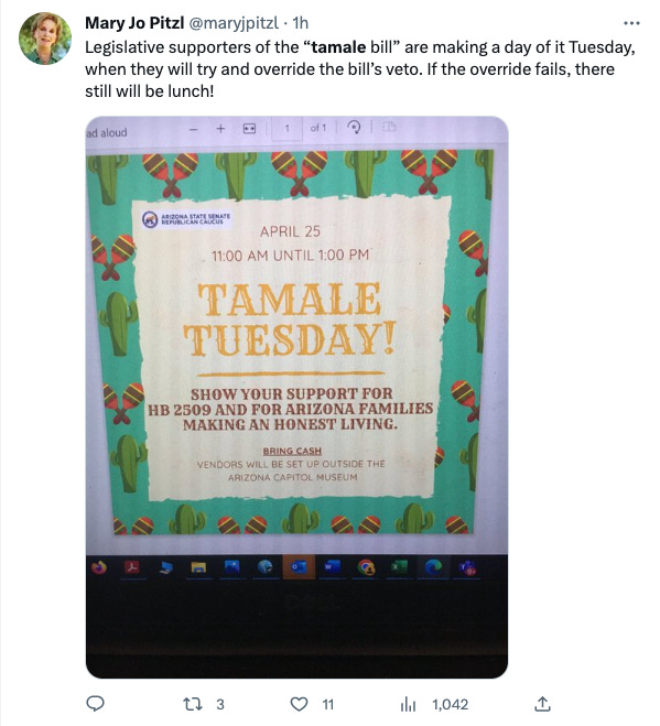 The tamale bill won’t die: There will be an attempt today to override Gov. Katie Hobbs’ veto on the so-called “tamale bill,” House Bill 2509, but Democrats in both chambers say they won’t be voting in favor of it, despite their earlier support for the bill. Senate Democrats said last week they wouldn’t be part of a political game between the GOP and Hobbs, and House Democrats said they’d instead like to work together on improved policies for cottage food businesses this session rather than roll the governor. Democratic Rep. Alma Hernandez said she intends to break with her caucus and vote in favor of the override, though, saying “there are other Dems who are with me.” An override would need two-thirds support in both chambers; without most Dems, that won’t be possible. Senate Republicans, meanwhile, are planning “Tamale Tuesday” today, where vendors will sell cottage foods outside the Arizona Capitol Museum.