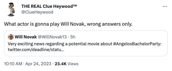 Well, Novak’s adventure at Angelo’s Bachelor Party could become a movie. The producers who own Novak’s life rights (sounds ominous!) tapped a writer for the film, dubbed “Reply All,” as the story is resurfacing again on TikTok.