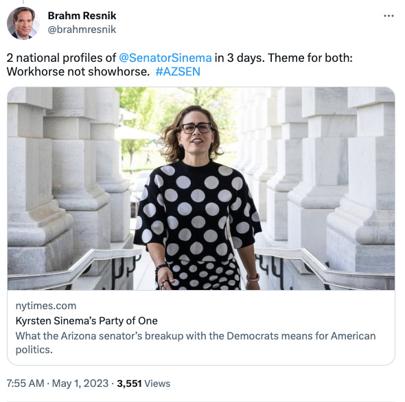 Sinema may or may not run but meanwhile she can't resist the temptation to respond to some big donor's plea to intervene in a zoning dispute: https://twitter.com/AnnHeitland/status/1653116116678623232