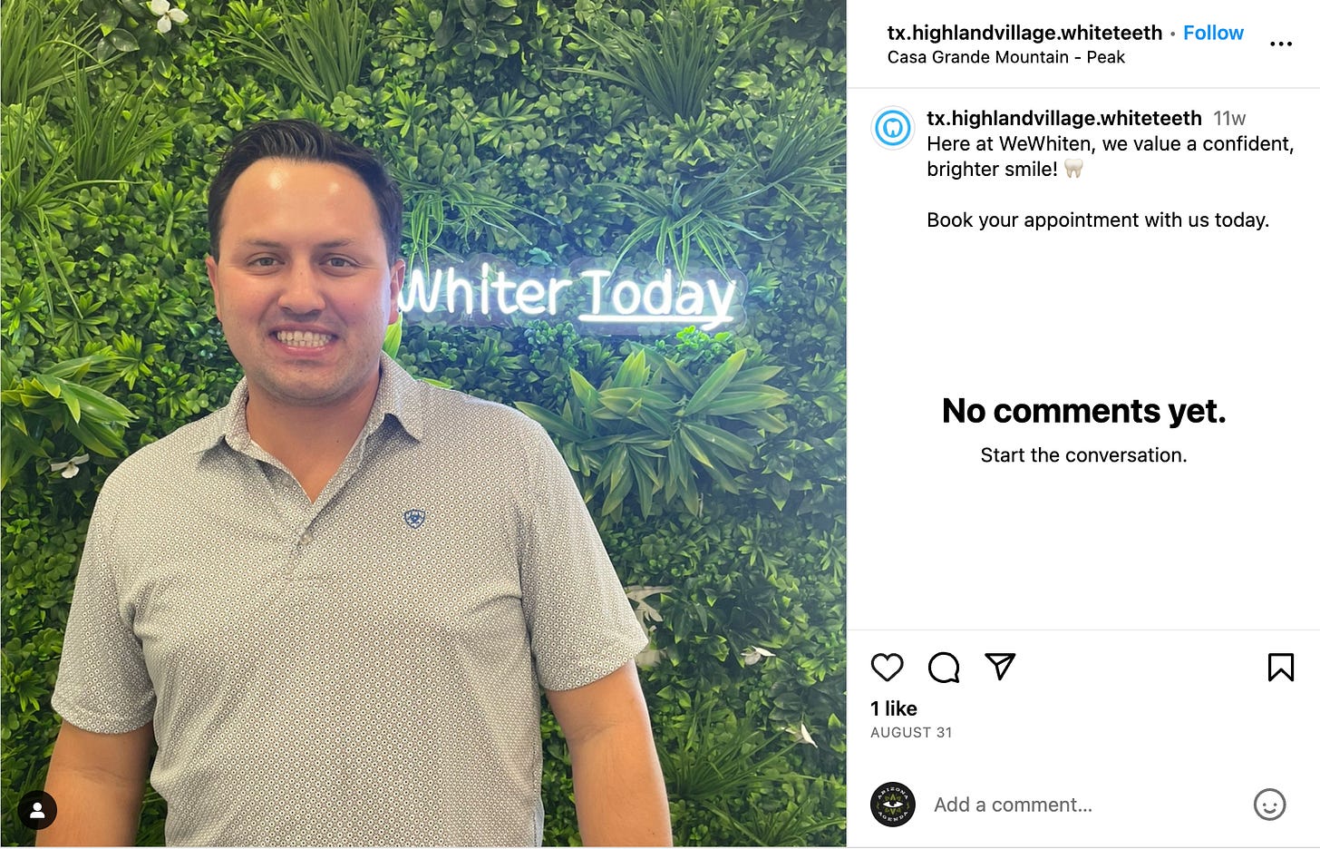Someone recently sent us this Instagram post from a Texas-based teeth-whitening shop featuring a bright, white smile from a satisfied customer.