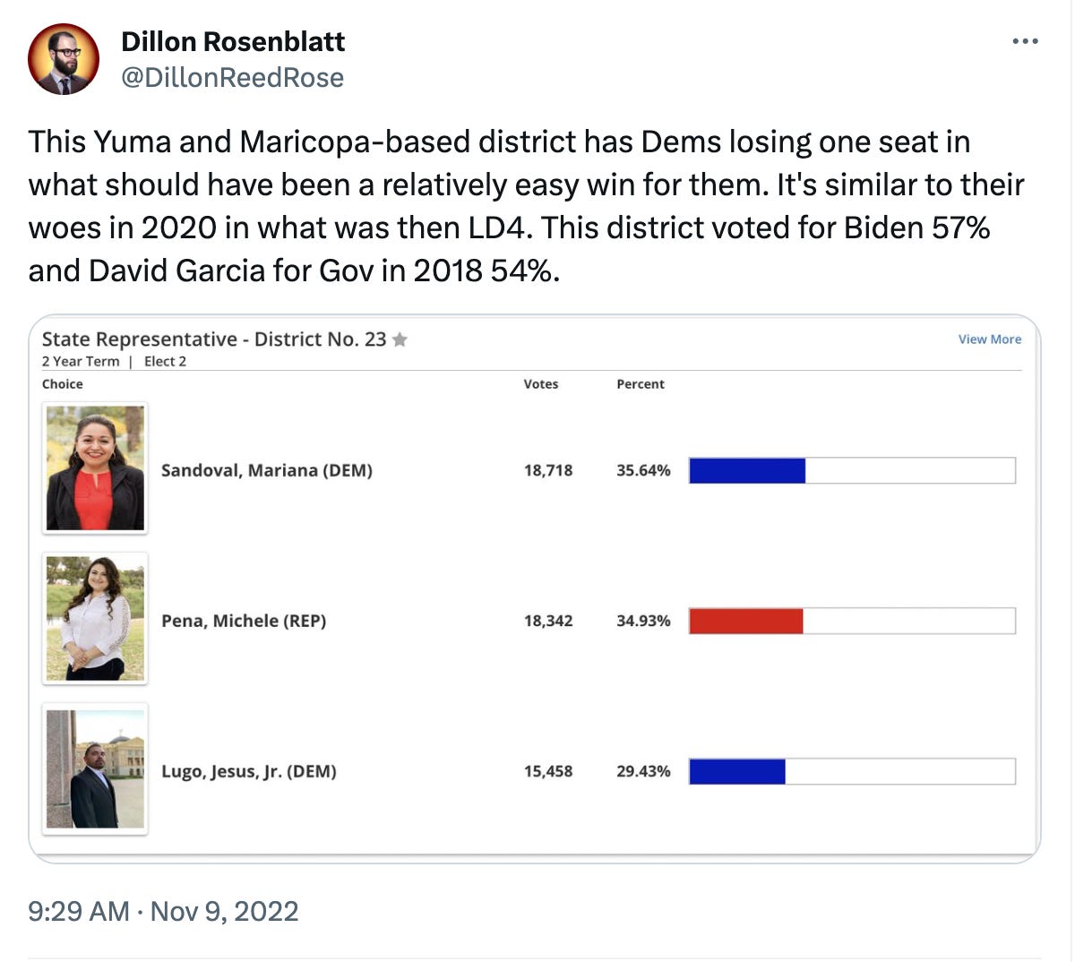 Democrats didn’t employ the single-shot strategy in Mesa’s LD9, which is the most Democratic-leaning of the five competitive districts, and won both seats. Democrats would have tied the House this year, having won all of the competitive seats they actually contested, except they lost a “safe” Democratic seat to Peña in Yuma.