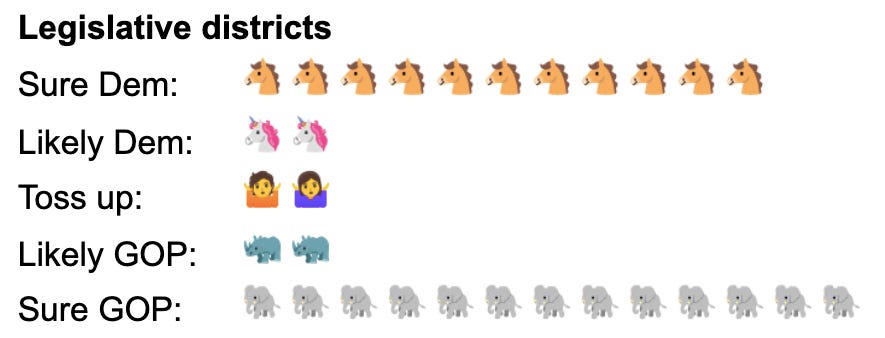 Still, expect hard-fought battles in the districts that lean toward one party or another. Four legislative and four congressional districts are leaners.