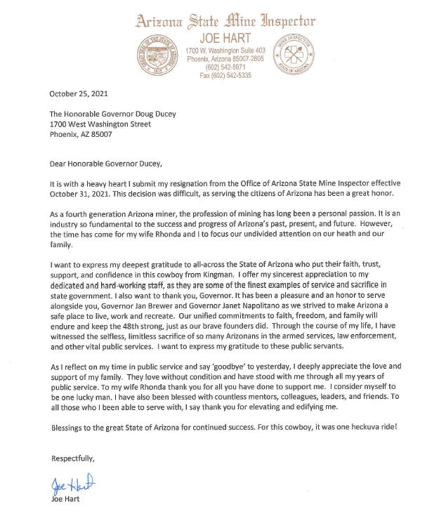 Joe Hart, a Republican, has held the job since 2007, making him the longest-serving statewide elected official. He wrote a resignation letter to Ducey on Oct. 25, but didn’t announce he was stepping down publicly. He still hasn’t. His resignation was effective Oct. 31.