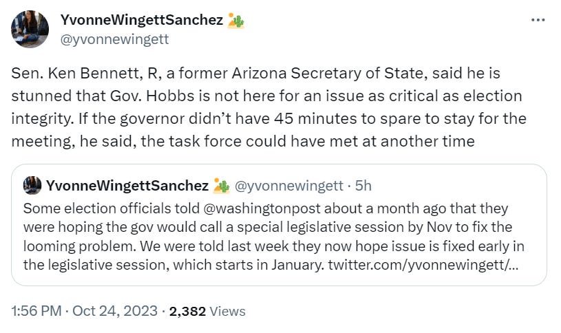 But the results of the Governor’s Bipartisan Elections Task Force probably don’t merit much more attention than Gov. Katie Hobbs gave them — she bailed on the task force’s big meeting yesterday after some brief opening remarks and instead sent her office lawyer and “proxy vote” Bo Dul, who Zoomed in as the rest of the task force members showed up in-person.