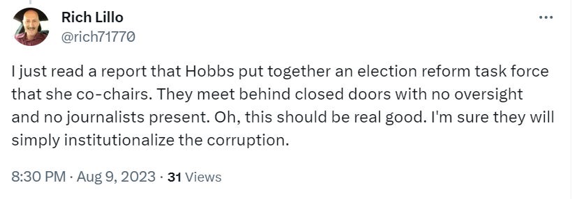 "Beyond that, the secretive, closed-door meetings through which Hobbs’ hand-picked election experts developed their recommendations don’t inspire confidence and instead feed the narrative that the election elitists don’t want us to know what they’re doing."