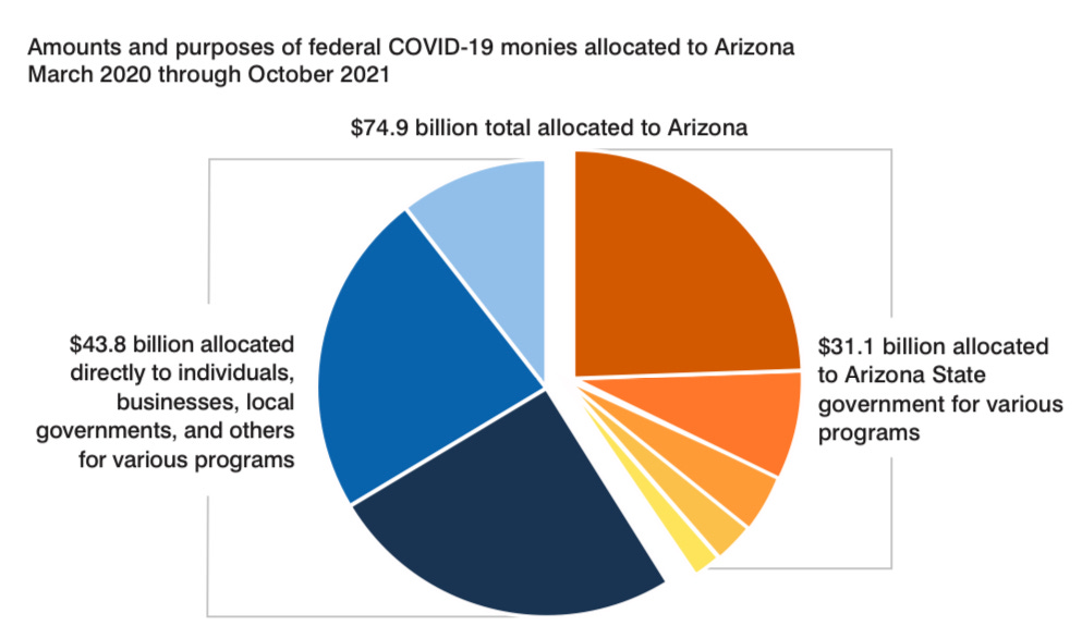 Nearly $75 billion came into Arizona from federal COVID-19 relief programs, the majority of which went directly to people, businesses or local governments, a new report by the Arizona Auditor General said. (To put that into perspective, the entire state budget is roughly $13 billion.) The report breaks down where the money went at a very high level (we still want all the low-level details on this stuff). And it notes a few problems with how the funding has played out here, including a lack of fraud measures at the Arizona Department of Economic Security before the increased unemployment insurance amounts went out and a late report from the Arizona Department of Administration.