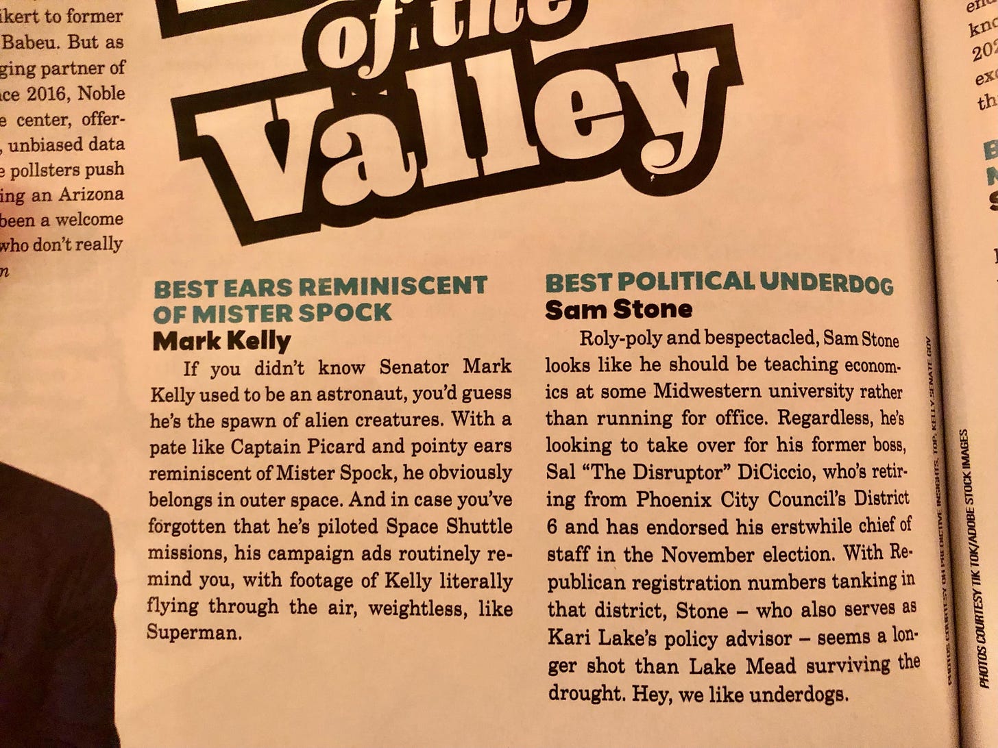 Check out these two winners: U.S. Sen. Mark Kelly, for “best ears reminiscent of Mister Spock,” and Phoenix City Council hopeful Sam Stone, for “best political underdog,” who the magazine said “looks like he should be teaching economics at some Midwestern university.”