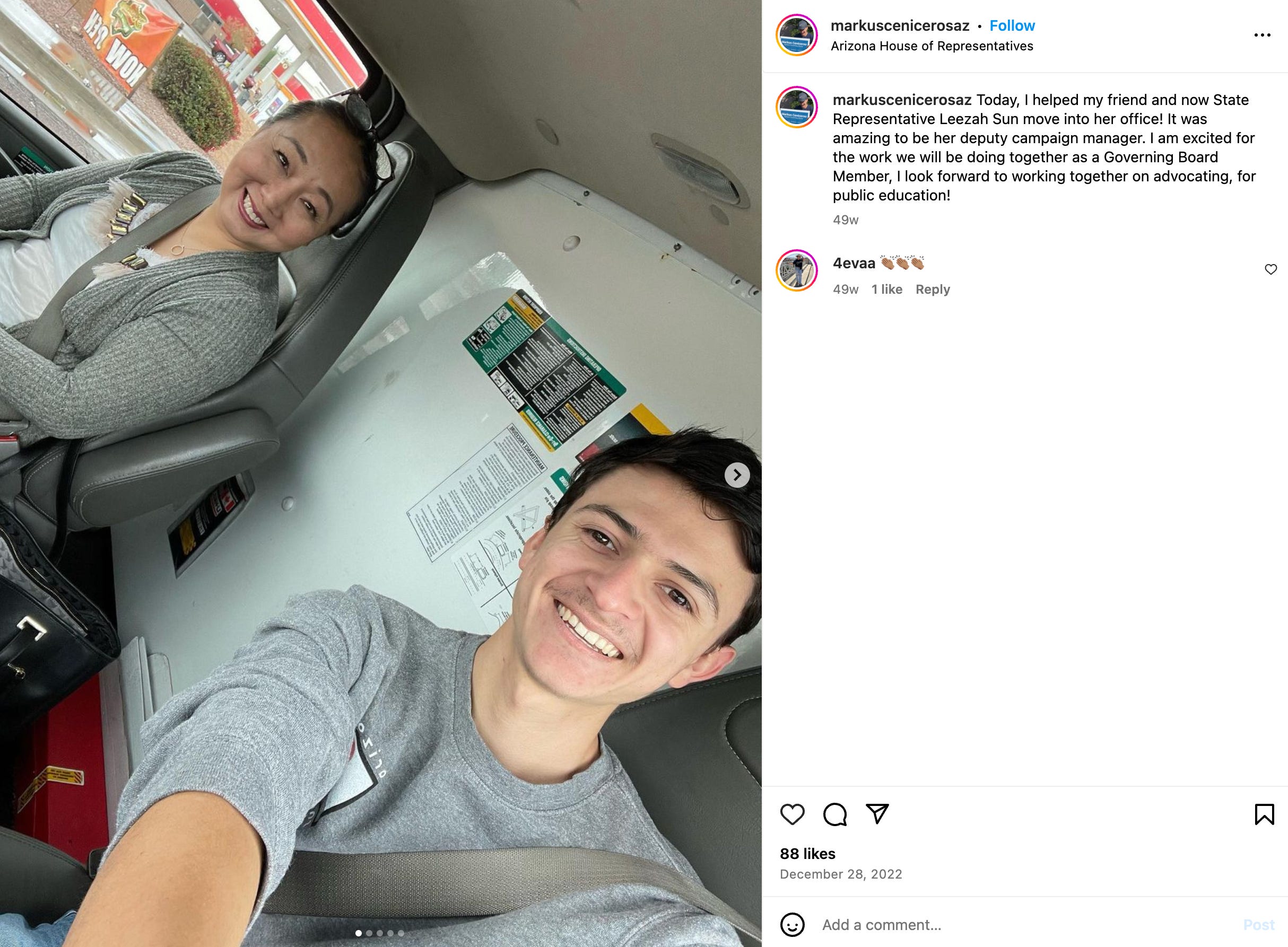 Freeman said that during that meeting last December, about a month before Sun was officially sworn in as a lawmaker, Sun broke into a long rant defending Markus Ceniceros, a high school senior and candidate for the Littleton School Board who worked on Sun’s legislative campaign and was criminally charged for stealing opponents’ signs on Sun’s behalf. (He won his race.)