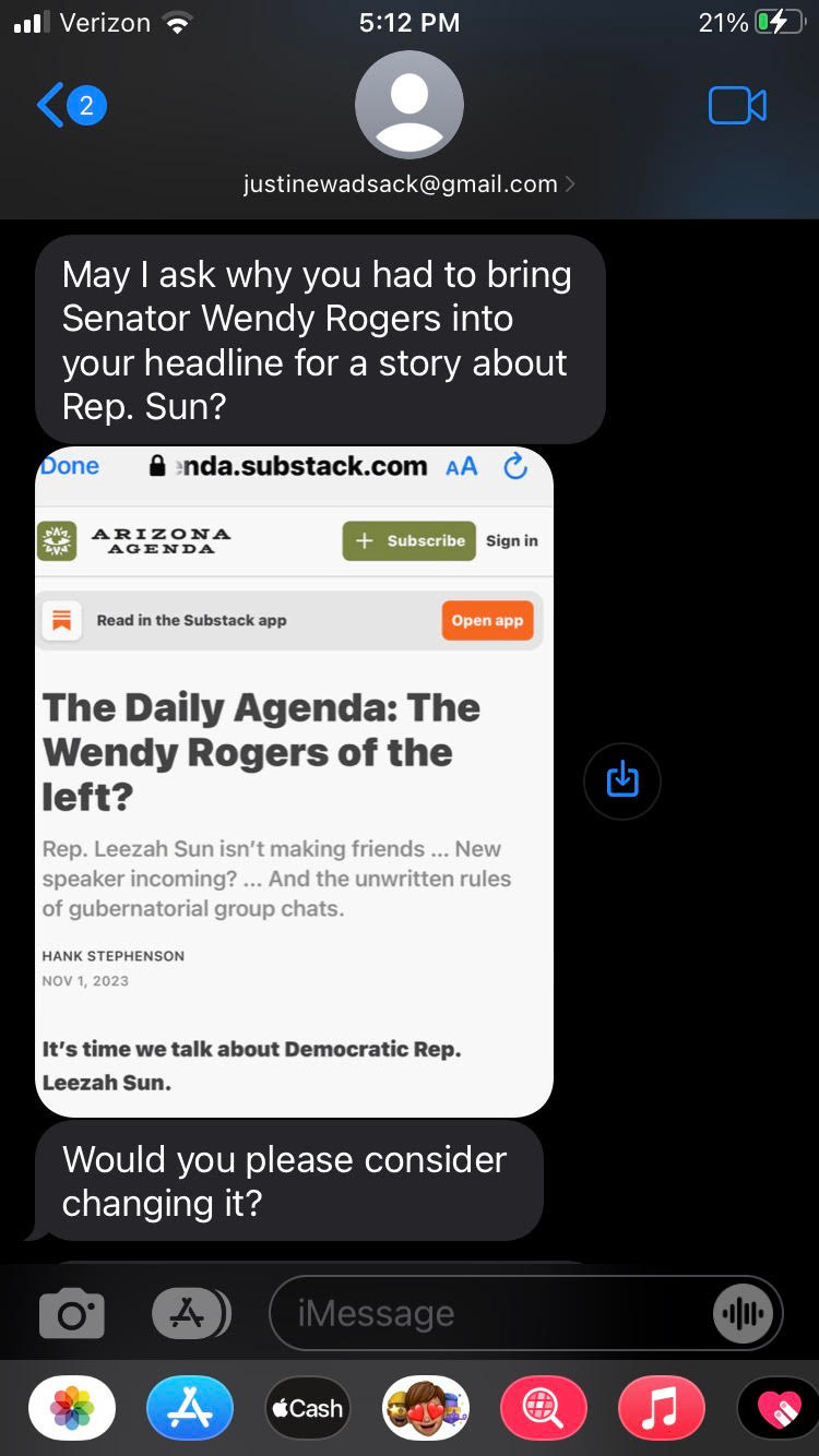 Speaking of Republican Sen. Justine Wadsack, she hit us up yesterday!