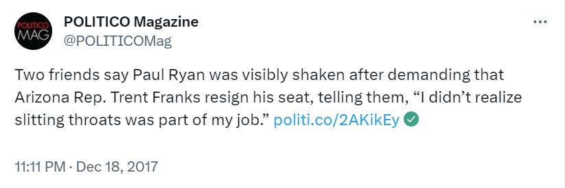 Franks resigned at then-House Speaker Paul Ryan’s request amid an ongoing ethics investigation in 2017. (The Ethics Committee investigation eventually found he engaged in sexual harassment “and/or” retaliation against his staff.)