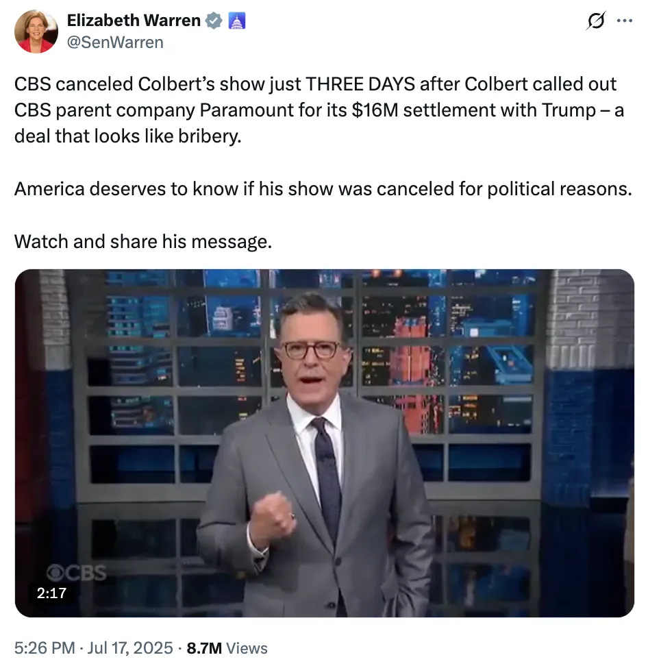 And while we’re on the topic, CBS’ recent decision to fire “Late Night” host Stephen Colbert — which Trump celebrated and used to warn Jimmy Kimmel that he’s next — also looks suspicious as all hell.