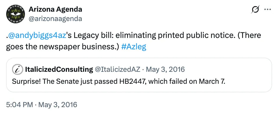 Case in point: Back in 2016, Hank wrote a series at the Arizona Capitol Times that really pissed off a handful of leaders at the state Capitol. Former Senate President Andy Biggs had made it his longtime goal to kill off newspaper public notices — a revenue stream that newspapers, and especially the Capitol Times, relied on. That year, he finally muscled a bill through that said certain companies no longer had to publish their articles of incorporation in a newspaper.