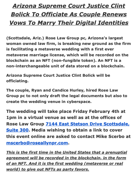 Supreme Court Justice Clint Bolick is going to officiate what may be the first NFT metaverse wedding ever. What a time to be alive. If that’s what you call this.